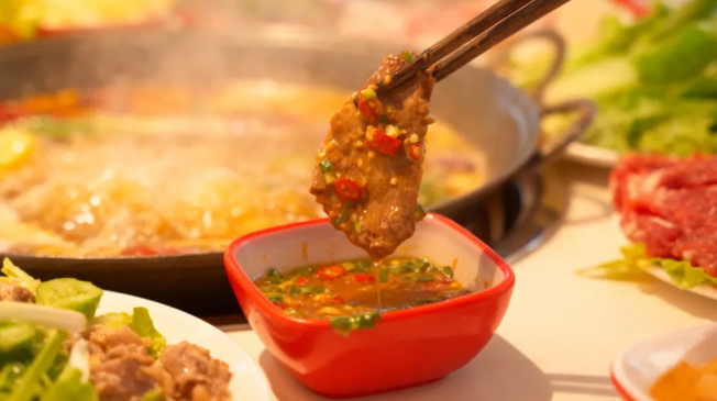 還能依據(jù)個人口味撒上花生碎、香菜等配料,調(diào)制成千人千碟的蘸料,接下來就盡情涮火鍋吧。